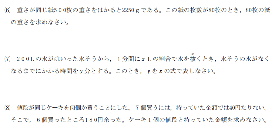 (6)は比例、(7)は反比例、(8)は一次方程式の問題で、すべて1年生の内容です。