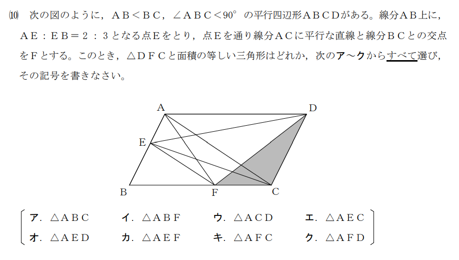 (10)は2年生の等積変形です。この前学習したばかりの内容です。平行線を見つけることがポイントでしたね。