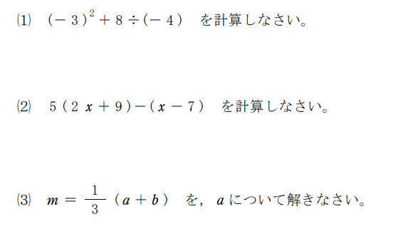 (1)は1年生の正負の数、(2)は同じく1年生の文字の式、(3)は2年生の等式の変形です。
