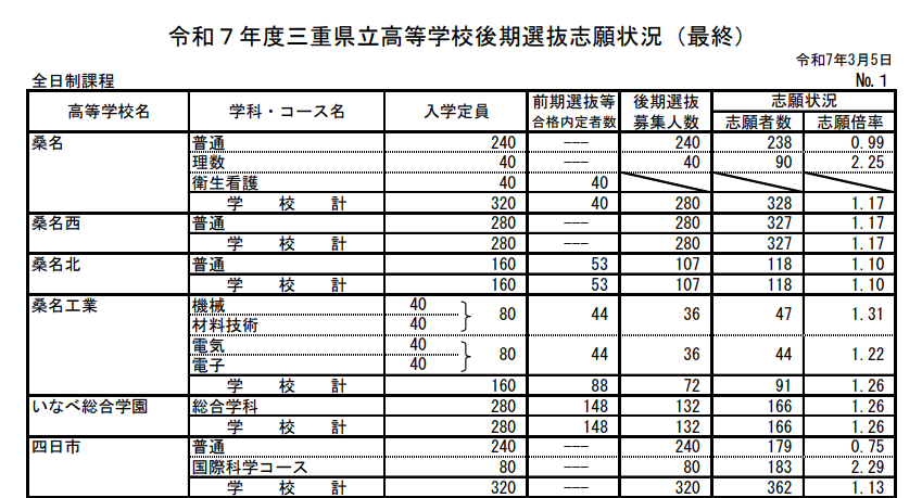 県立高校後期選抜の最終志願状況が発表されました。