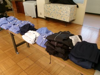 また、卒業生が寄付してくれた制服や体操服もたくさん並べられていました。皆さんご協力ありがとうございました。