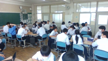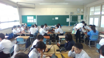 タブレットを使い、ファイルを共有しながら班で相談していました。