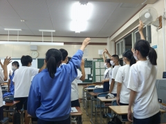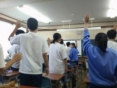 クイズが出題され、各教室でクラス対抗で回答を競い合いました。ジェスチャークイズや〇✖クイズなど、一問ごとに一喜一憂しながら夢中になって回答する様子がありました。中には、