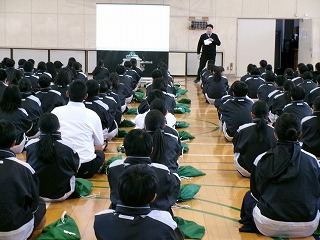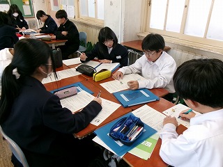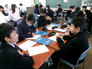 今日は体育館で説明を聞いた後、教室に戻ってどの班がどこの地区を調査するかや班内の役割分担を決めました。1年生のみなさんは「どこにいきたい?」「私地図係がいい」など班の仲間とたくさん話し合っていました。
