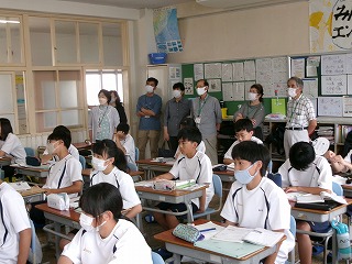 授業の参観後、校長室で懇談を行いました。授業の感想や、地域で気にかかることについて、感想、ご意見をいただきました。 ・1年生の授業に向かう姿勢が、4月と比べてすごく落ち着いていて、中学生らしくなっていて、成長を感じた。 ・生徒同士の教え合いが自然にできていて、良い雰囲気を感じた。 ・3年生の授業に向かう姿勢は、意識が高くて、すごいと感じた。 ・全体的に、楽しく、一生懸命授業に向かっている雰囲気がよかった。 ・登下校の様子が気になる。特に自転車で道いっぱいに広がっていて、危ないと感じる。 ・「止まれ」のある交差点で、止まらない車もいるので、十分気をつけてほしい。 ・朝、登校の見守りをしているとあいさつをしてくれる生徒が多い。 ・車を運転していて、自転車や徒歩の生徒に道をゆずると、会釈してして通る生徒が何人もいて、気持ちが良い。