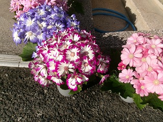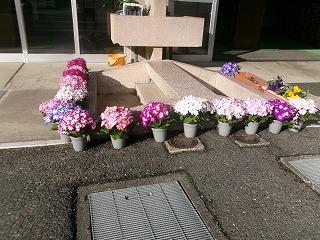 卒業式で会場を華やかにしてくれたサイネリアが、昇降口でみなさんの登下校を見守ってくれています。