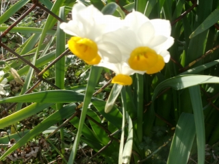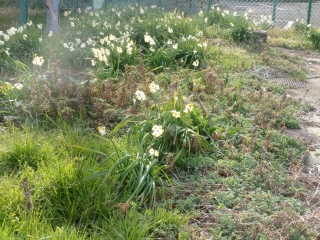 駐車場のフェンスに囲まれたところには水仙が咲いています。