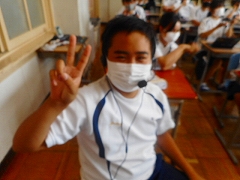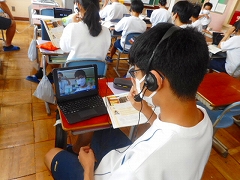 タブレットとヘッドセットを使って、クラスの誰かとお話しします。