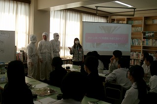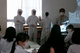 さらに、各クラス3人ずつが工場に入るときに着るクリーンスーツの着用体験をしました。初めてクリーンスーツを着て、とても興味深そうにしていました。