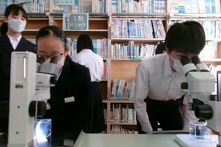 3年生のみなさんは講師の方のお話を一生懸命に聞いていました。また、実物のウェハを間近で見てここからいくつのメモリができるのかを考えたり、顕微鏡を覗いてメモリの細かいところを興味深く観察したり、VRゴーグルを使い工場のメモリの製造ラインを見学したりしました。