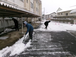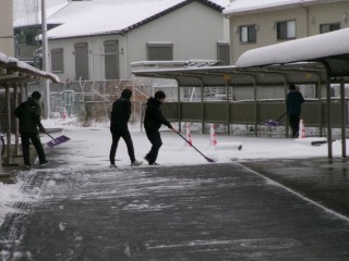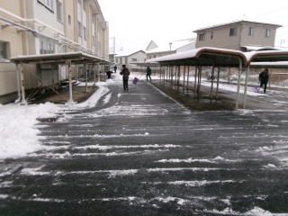 皆さんの登校前、朝早くに出勤していた先生の何人かが自主的に雪かき用スコップをもって自転車小屋に向かい、雪をどけました(そのままの状態だったら、自転車はこげませんし、コケるのが予想されました)。