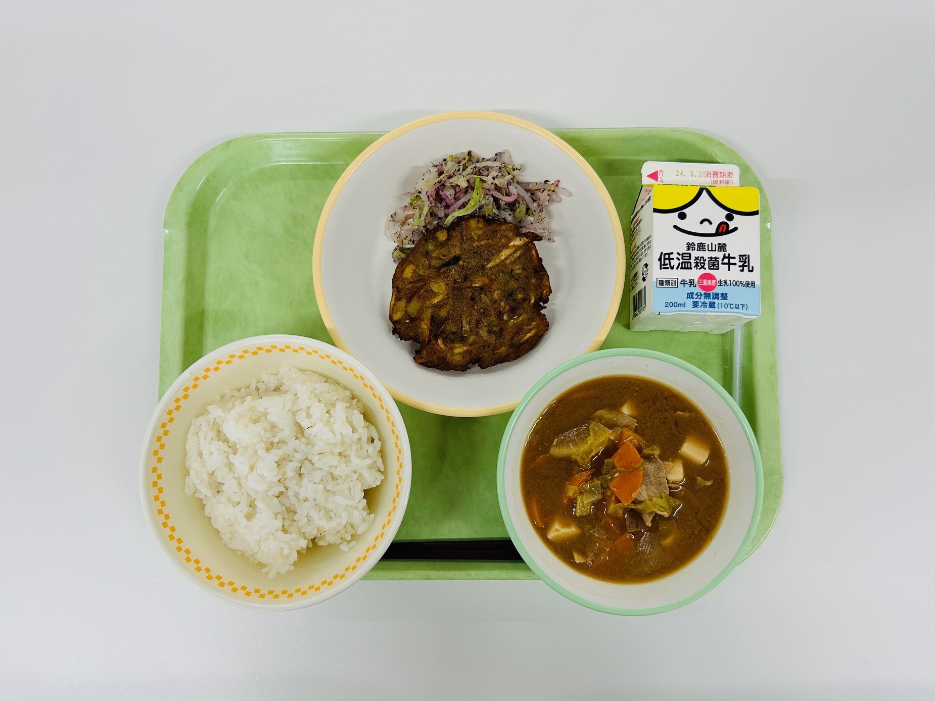 今日の給食は、「骨こつかきあげ」「ゆかりあえ」「豚汁」です。