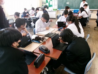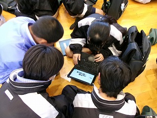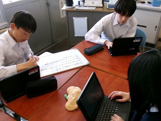 学校に戻ってからタブレットにクラスで発表する内容をまとめました。実際の写真を使い、発表する内容を班のみんなで考えていました。