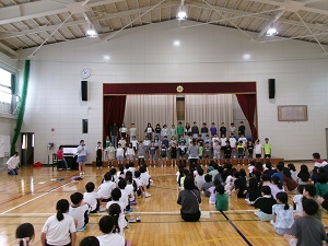 最後に、5年生と6年生が三泗小学校音楽会で歌う「地球星歌」の発表がありました。歌声が重なる部分がとても素敵な合唱でした。