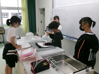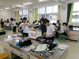 6年生は今、家庭科の時間に修学旅行で使うナップサックを作成しています。手縫い、ミシン縫いの両方を使い分けて一生懸命作成していました。昨日(10月16日)はやさにしっこサポーターさんにサポートしていただきながら丁寧に作業を進めていました。