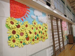 体育館の壁面には、3年生が制作した飾り(夏のもの)が貼られています。