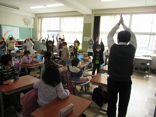 3月1日(水)、2年生では、英語の曲に合わせて、グレン先生と一緒に子どもたちがたくさん体を動かしていました。先生も子どもたちもとっても楽しそうでした。