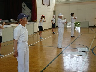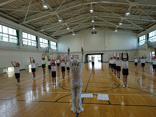 講師は地域の植松さん。植松さんはラジオ体操指導士で、毎年6年生にラジオ体操の指導をしていただいています。