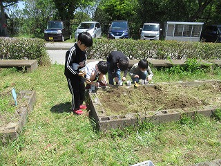 昇降口前の学級園では、草ぬきをしたり、苗を植えたりする子どもたちの姿をよく見かけるようになりました。
