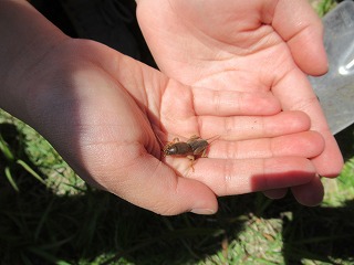 「あ~オケラだよ。」と手に取ってみせると、「何・なに?なに?」と集まってきた子どもたち。なかなか、ユニークな体をしているオケラですが、土に戻してあげるとすごい勢いで土を掘ってもぐっていきました。