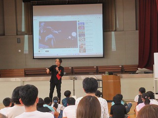 9月22日(金)は、授業参観のあと、子どもの未来を語る会の第一部として講演会を開催しました。四日市市出身の津軽三味線兄弟ユニットKUNI-KENの松永訓明さんを講師にお招きし、5,6年生の子どもたちに向けて「誰にも負けない“好き”を見つけよう~どれだけ熱くなれますか?~」という演題でお話しいただきました。