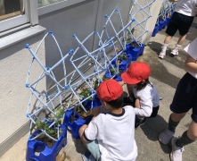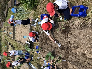5月12日(金)三重興農社さんに来ていただき、畑つくりを手伝っていただきました。個人の植木鉢に育てたい野菜を植えて、学級園には興農社さんに頂いた様々な野菜の苗を植えました。子どもたちは「植えたい」「やりたい」と積極的に活動していました。毎日の水やりを欠かさずに野菜が育つ喜びを感じてほしいです。