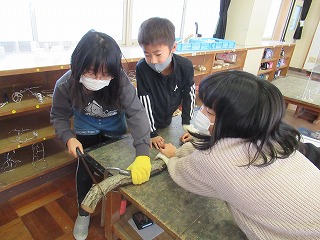 3年生では、先週、グリーンボランティアの方に来ていただき、のこぎり体験をしました。のこぎりの刃の説明からはじめ、安全にのこぎりを使う方法を、まずはしっかりと教えていただきました。