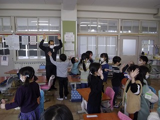 2学期にも勉強した、気持ちを表す言葉(happy,hungryなど)を復習したり、英語の歌に合わせて体を動かしたりしました。ペアを作って向き合い、お互いの顔を見ながら楽しそうに活動している姿が見られました。