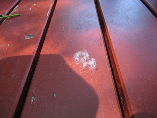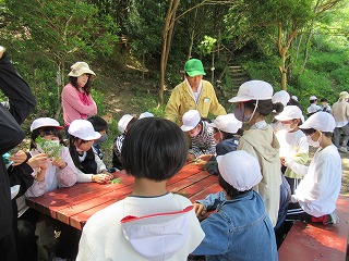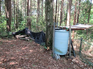 4年生が昨年度、シイタケの菌打ちをした原木について、グリーンボランティアの山本さんから、今後の作業について教えていただきました。次の写真は、原木が乾燥してしまわないように、ときどき水をかけるために雨水をためるドラム缶です。
