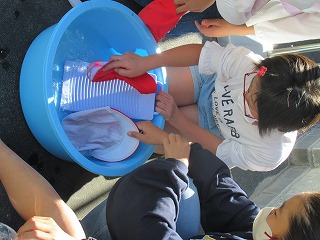 この日は、洗濯板を使って赤白帽子の洗濯に挑戦していました。
