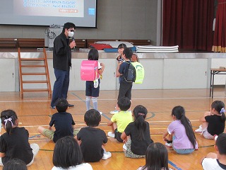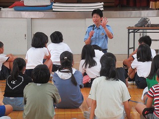柴田さんから、警棒等の警官の皆さんが普段身につけているものを見せてもらったり、警官の仕事について話をしてもらう場面もあり、子どもたちは、興味をもって話を聴いていました。