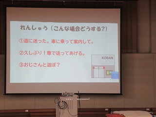 大きな声で「助けて」と叫ぶ練習の後、実際に、知らない人から声をかけられた場面を想定して、代表の子どもがどうするとよいかをやってみて、考え合いました。