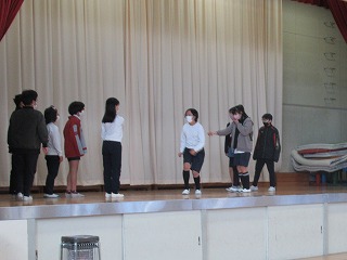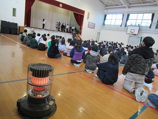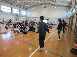 終業式のあと、6年生の子どもたちが、長縄の跳び方や短縄の技(にじゅうとびやはやぶさなどもありましたね)をやって見せてくれました。釘付けになって見ている低学年の子がいましたよ。