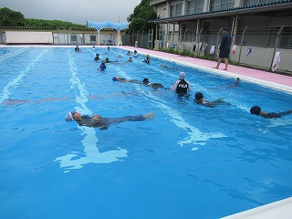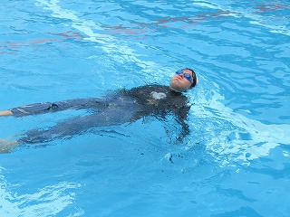 服を着て、泳ぐのは、とても体力を使ってしまいます。大切なのは浮くこと。