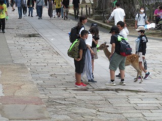 子どもたちが、楽しみにしていたことの一つに、鹿との触れ合いがありました。鹿せんべいを買って、鹿がいる方向に向かって、かけていく子もいました。かわいい鹿ですが、いざ鹿せんべいに向かって近づいてくると・・・びっくりしている子もいましたね。