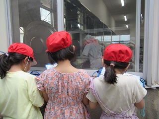 窓の外から給食室を見学させていただきました。「なかよし給食」と言って、三重北小学校で調理した給食を八郷西小学校の子どもたちは、食べています。その様子は、1年生のときに、小林先生に教えてもらいましたが、今回、自分たちの目で確かめてくることができました。