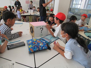 ❔はてな)ボックスに入っている野菜は何かな??みんな、とても楽しそうに取り組んでいました。