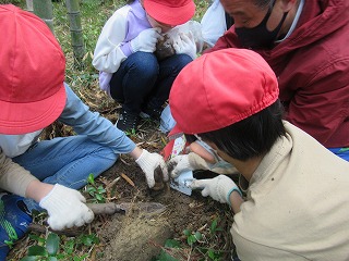 地域のNPO法人PPK四日市の皆さんにお手伝いいただきながら、子どもたちは竹林の中を歩き回って、タケノコを探し、そして、見つけると「あった!!」と大きな声を出して、なかまを呼び、力を合わせて一生懸命に掘り起こしていました。
