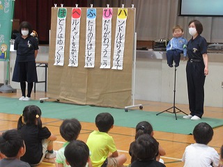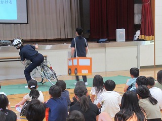 腹話術によるケンちゃんが自転車を乗るときに気を付けることを教えてくれました。
