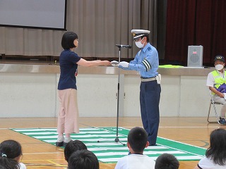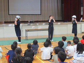6月19日(月)は、低・中・高学年に分かれて、それぞれ1時間ずつ交通安全教室を行いました。四日市市北警察署にご協力いただき、とみまつ隊の皆さんにご指導いただきました。