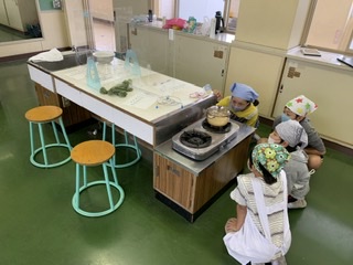 透明な鍋を使い、中の様子を観察しながら調理しました。沸騰している時は、「大丈夫かな?」と不安になったり、火を切る時に「もういいかな?」と確認したりしていました。