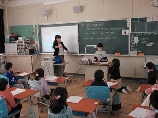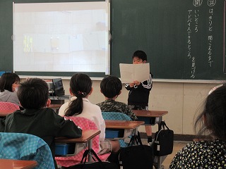 1年生は、生活科「学校林で集めたもので作ったもの」の発表していました。書画カメラで作ったものを拡大して見せながら、前で自分の言葉で伝えることを頑張っていました。