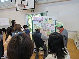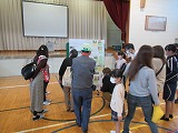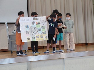 4年生は、体育館で、地域の方と作成した防災マップを使いながら、舞台の上で発表を行っていました。