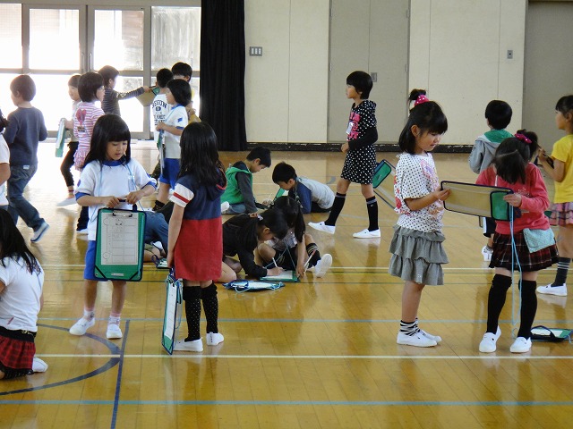 今日は、A組とB組が一緒に、体育館で「生活」を勉強しました。じゃんけんをして、勝ったら、友達に名前を書いてもらいます。中には、もじもじしてなかなか声をかけられない子どももいましたが、様子を見ていると、勇気を出して声をかけにいっていました。クラスを問わず、たくさんのお友達を作ってくださいね。 |