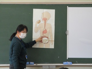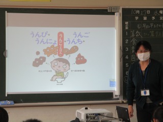 栄養教諭から2年生が食育の勉強を受けました。今までにも食育に関する授業を受けてきましたが、今日は「うんこ」という視点から食を考えました。