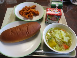 今日は、「黒糖パン」「タンドリーチキン」「かぼちゃのスープ」「牛乳」「チョコのケーキ」でした。子どもたちは、とても喜んでいました。