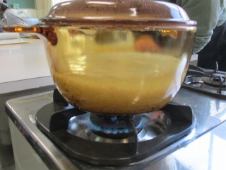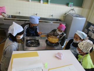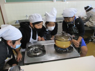 今日は、5年生の「炊飯」の授業です。お世話になった小崎さんの田んぼでとれたお米を使って、ガラスの鍋で炊きました。様子を見ていた子どもたちから「うわぁ、お米が立ってる!」「すごくいい匂いだね。お餅の匂いだ!」と歓声が上がっていました。