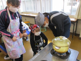 炊き上がったご飯は、教員が個々の入れ物に分け、給食の時間に黙食で食べました。「おいしくできたよ。」「少し焦げたけど、おこげもおいしかったよ。」などと教えてくれました。