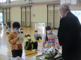今日は1年生がサツマイモ掘りでお世話になった村上さんを招いてサツマイモパーティを行いました。