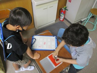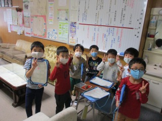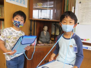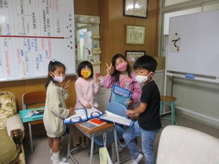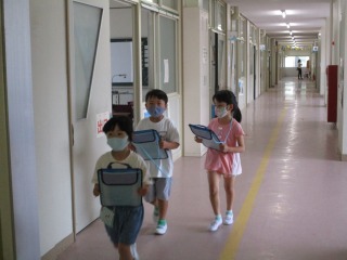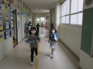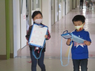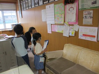 1年生が生活科の授業で「がっこうたんけん」に出かけました。体育館、音楽室、学校資料室、理科室、図工室、職員室、保健室…など、たくさんの場所に二人組で出かけました。出かけた先には、「はんこ」と「秘密の暗号」がおいてあります。子どもたちは、大喜びで回っていました。楽しく活動することができました。はやく学校のこと、覚えてくださいね。